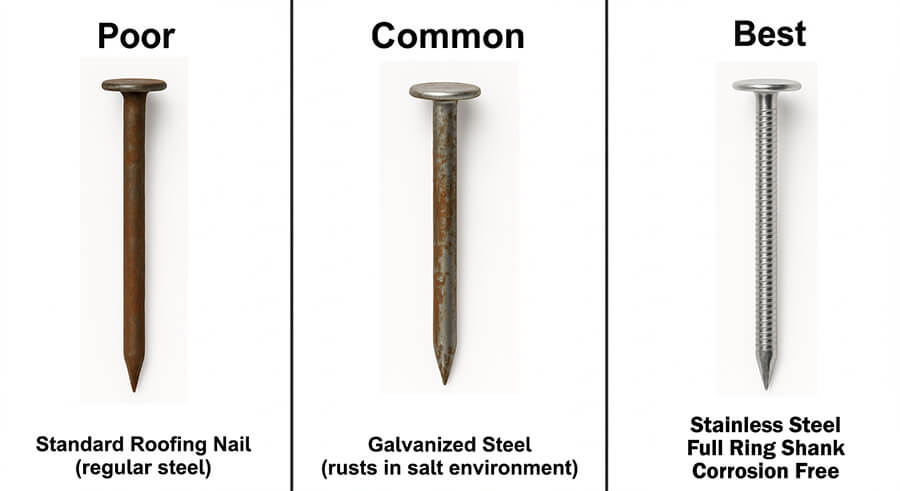 - Corrosion Protection: Stainless nails, flashing, and pipe boots resist rust in salt air.